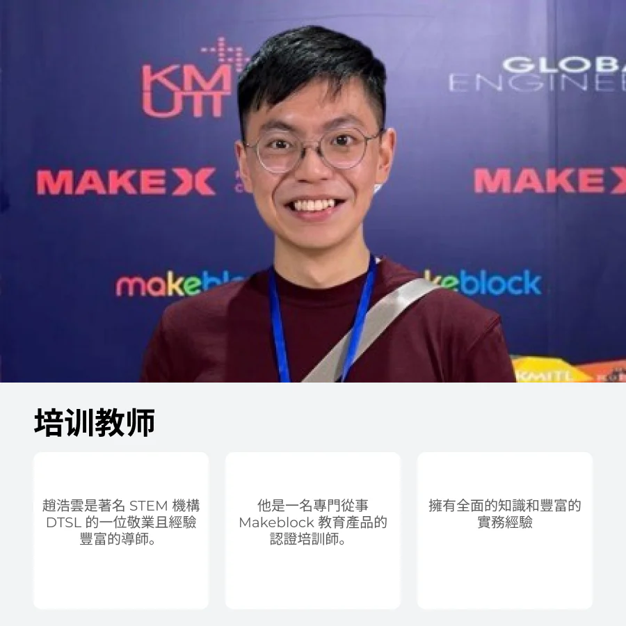 趙浩雲導師 (Mr. Howard Chiu) 來自著名 STEM 機構 DTSL,他是一位專門從事 Makeblock 教育產品的認證培訓導師,擁有全面的知識和豐富的實務經驗。