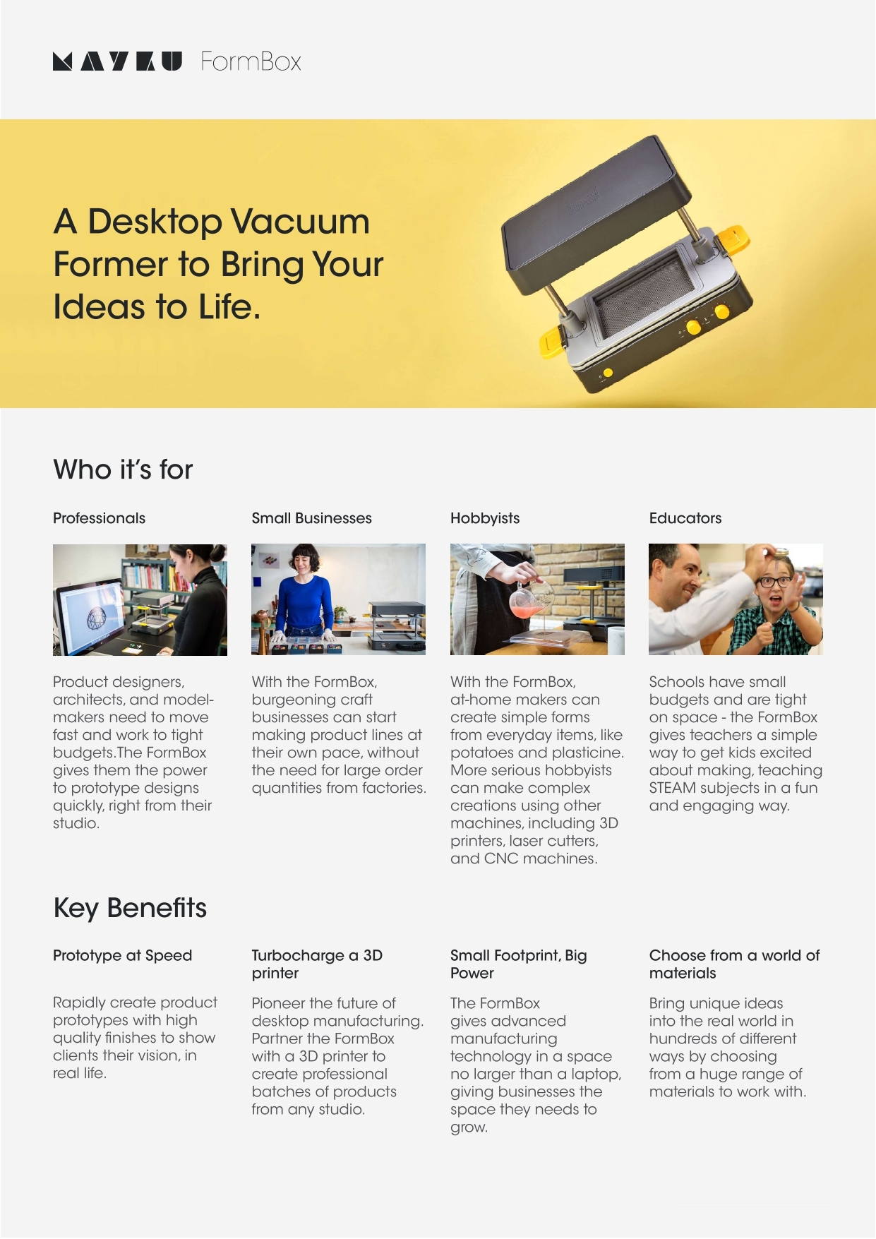 將工業用真空成型技術放上桌面,能使用任何家用吸塵器提供動力,並可與各種材料配合使用;快速、經濟、多功能且使用容易,快速將你的想像化為現實及量產.