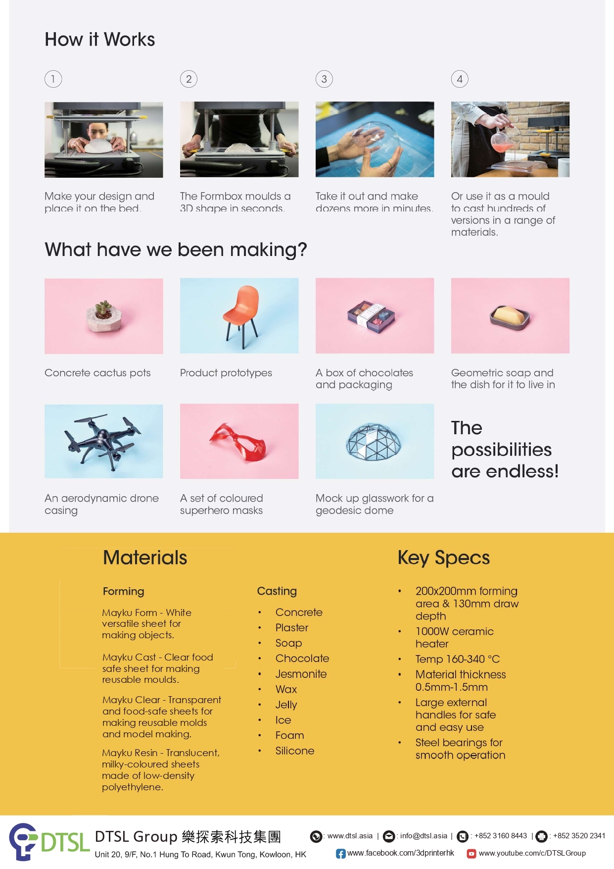 FormBox將工業用真空成型技術放上桌面,能使用任何家用吸塵器提供動力,並可與各種材料配合使用;快速、經濟、多功能且使用容易,快速將你的想像化為現實及量產。 每部FormBox已包括20張Form Sheets, 20張Cast Sheets, 1kg 成形材料, 3個初階模型及1個適用不同家用吸塵器轉接頭。 *包括1年自攜保養及香港本地運費(離島及偏遠地區除外)